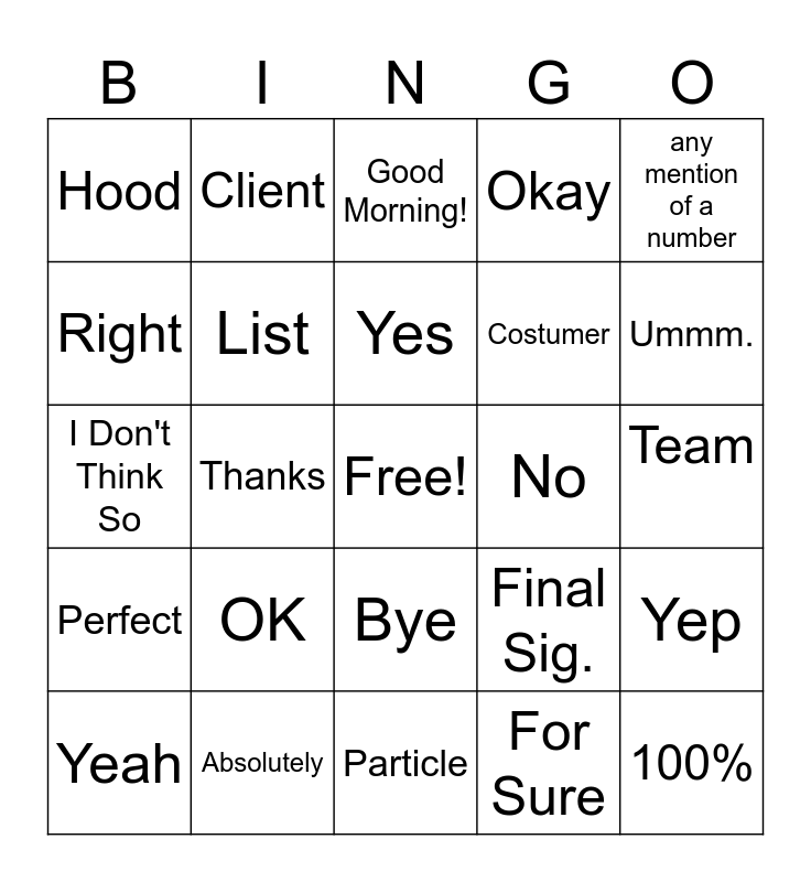 This bingo card has a free space and 24 words: Yeah, OK, Yes, For Sure, any mention of a number, Hood, Client, Good Morning!, No, Team, I Don't Think So, List, Final Sig., Yep, Right, Absolutely, Particle, Okay, Ummm., Perfect, Thanks, Bye, Costumer and 100%.