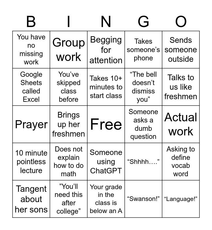 This bingo card has a free space and 26 words: Someone using ChatGPT, “Swanson!”, Takes 10+ minutes to start class, ”You’ll need this after college”, Sends someone outside, You have no missing work, Google Sheets called Excel, Group work, Actual work, “Shhhh….”, “The bell doesn’t dismiss you”, Prayer, Asking to define vocab word, Tangent about her sons, Brings up her freshmen, ”Go eat outside”, Takes someone’s phone, 10 minute pointless lecture, Begging for attention, “Language!”, Talks to us like freshmen, Your grade in the class is below an A, Someone asks a dumb question, Does not explain how to do math, You’ve skipped class before and Moaning & odd sounds.