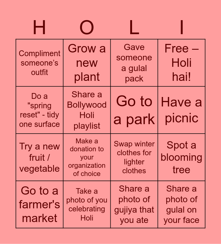 This bingo card has 16 words: Take a photo of you celebrating Holi, Spot a blooming tree, Gave someone a gulal pack, Compliment someone’s outfit, Try a new fruit / vegetable, Grow a new plant, Swap winter clothes for lighter clothes, Share a photo of gujiya that you ate, Do a "spring reset" - tidy one surface, Share a Bollywood Holi playlist, Go to a farmer's market, Free – Holi hai!, Make a donation to your organization of choice, Have a picnic, Go to a park and Share a photo of gulal on your face.