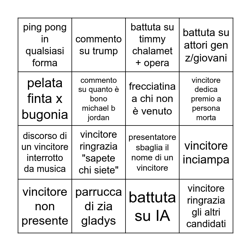 This bingo card has 16 words: parrucca di zia gladys, vincitore inciampa, battuta su timmy chalamet + opera, ping pong in qualsiasi forma, discorso di un vincitore interrotto da musica, commento su trump, presentatore sbaglia il nome di un vincitore, battuta su IA, pelata finta x bugonia, commento su quanto è bono michael b jordan, vincitore non presente, battuta su attori gen z/giovani, vincitore ringrazia "sapete chi siete", vincitore dedica premio a persona morta, frecciatina a chi non è venuto and vincitore ringrazia gli altri candidati.