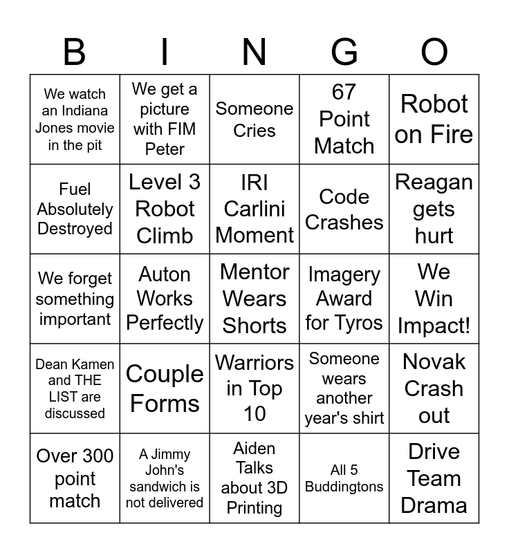 This bingo card has a free space and 24 words: Couple Forms, A Jimmy John's sandwich is not delivered, IRI Carlini Moment, Over 300 point match, Robot on Fire, We watch an Indiana Jones movie in the pit, Fuel Absolutely Destroyed, We get a picture with FIM Peter, Imagery Award for Tyros, Warriors in Top 10, Code Crashes, We forget something important, Someone wears another year's shirt, Novak Crash out, Level 3 Robot Climb, All 5 Buddingtons, We Win Impact!, Someone Cries, Reagan gets hurt, Auton Works Perfectly, Drive Team Drama, Dean Kamen and THE LIST are discussed, 67 Point Match and Aiden Talks about 3D Printing.