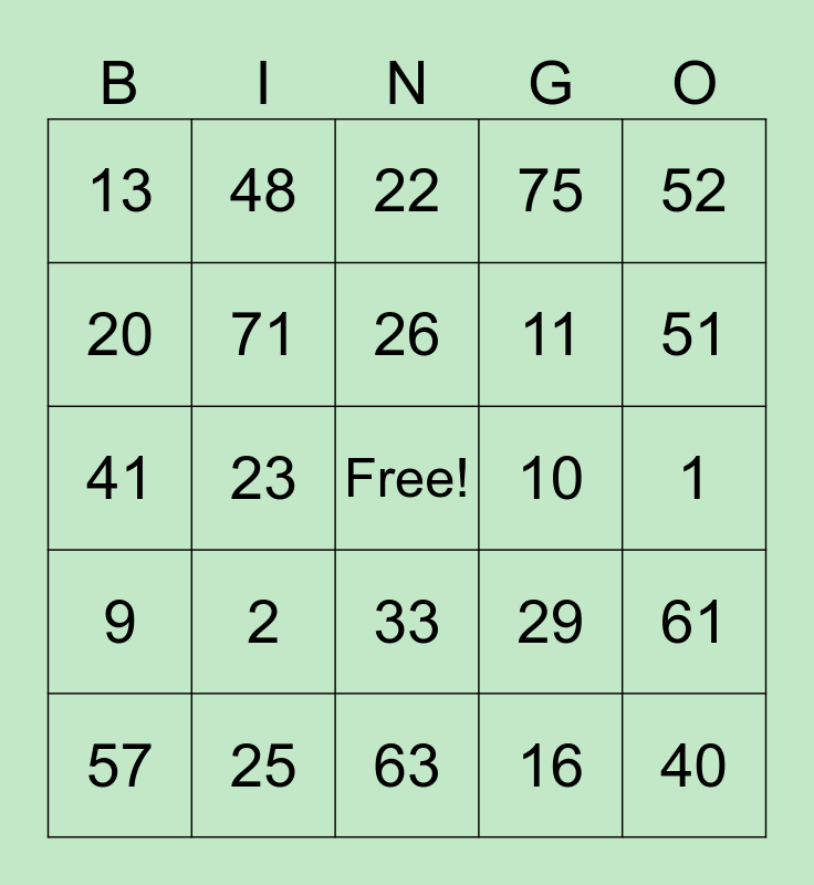This bingo card has a free space and 24 words: 2, 25, 26, 57, 52, 13, 20, 48, 10, 33, 11, 41, 29, 61, 71, 16, 1, 22, 51, 23, 40, 9, 75 and 63.