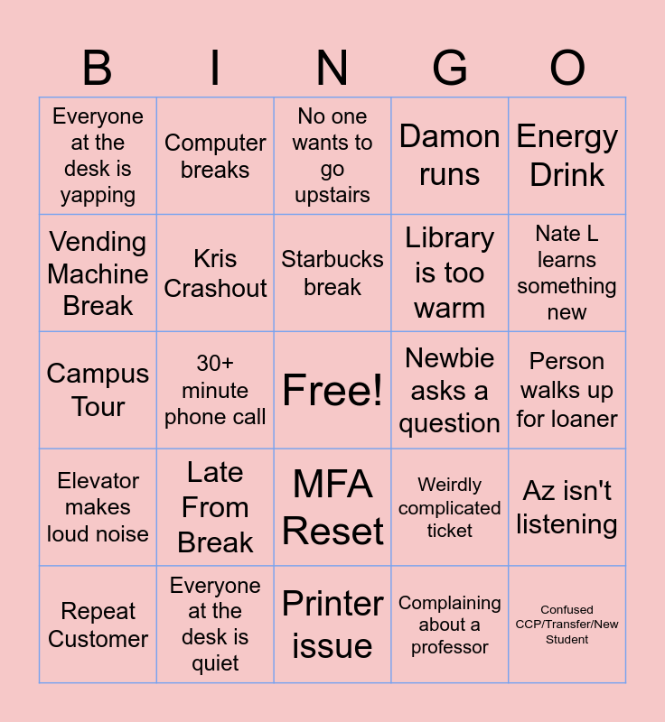 This bingo card has a free space and 24 words: Late From Break, Everyone at the desk is quiet, Starbucks break, Repeat Customer, Energy Drink, Everyone at the desk is yapping, Vending Machine Break, Computer breaks, Newbie asks a question, MFA Reset, Library is too warm, Campus Tour, Weirdly complicated ticket, Az isn't listening, Kris Crashout, Complaining about a professor, Person walks up for loaner, No one wants to go upstairs, Nate L learns something new, 30+ minute phone call, Confused CCP/Transfer/New Student, Elevator makes loud noise, Damon runs and Printer issue.