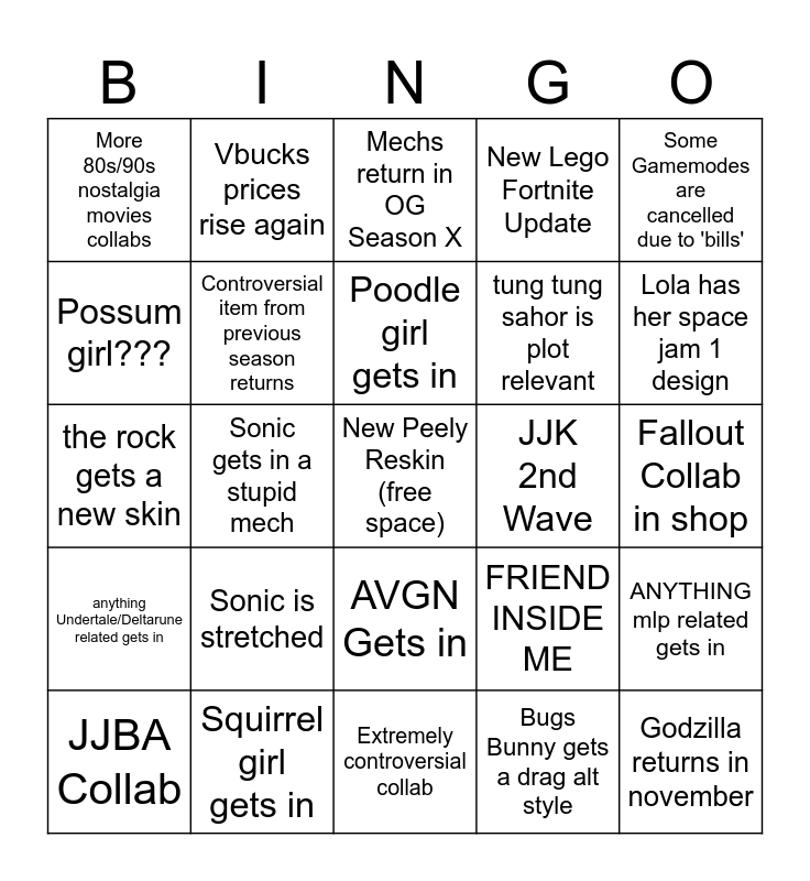 This bingo card has a free space and 24 words: Sonic is stretched, Squirrel girl gets in, Poodle girl gets in, JJBA Collab, Some Gamemodes are cancelled due to 'bills', More 80s/90s nostalgia movies collabs, Possum girl???, Vbucks prices rise again, JJK 2nd Wave, AVGN Gets in, tung tung sahor is plot relevant, the rock gets a new skin, FRIEND INSIDE ME, ANYTHING mlp related gets in, Controversial item from previous season returns, Bugs Bunny gets a drag alt style, Fallout Collab in shop, Mechs return in OG Season X, Lola has her space jam 1 design, Sonic gets in a stupid mech, Godzilla returns in november, anything Undertale/Deltarune related gets in, New Lego Fortnite Update and Extremely controversial collab.