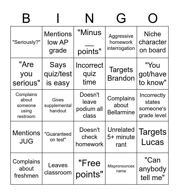 This bingo card has a free space and 28 words: Targets Lucas, Targets Ethan, Targets Brandon, Mispronounces name, "Are you serious", "Minus __ points", Mentions low AP grade, Mentions JUG, Complains about Bellarmine, Complains about freshmen, Complains about someone using restroom, Aggressive homework interrogation, Leaves classroom, "Free points", "You got/have to know", Leaves classroom, "Guaranteed on test", Says quiz/test is easy, Incorrect quiz time, Doesn't check homework, "Seriously?", "Nononono", "Can anybody tell me", Gives supplemental handout, Incorrectly states someone's grade level, Unrelated 5+ minute rant, Niche character on board and "Zero".