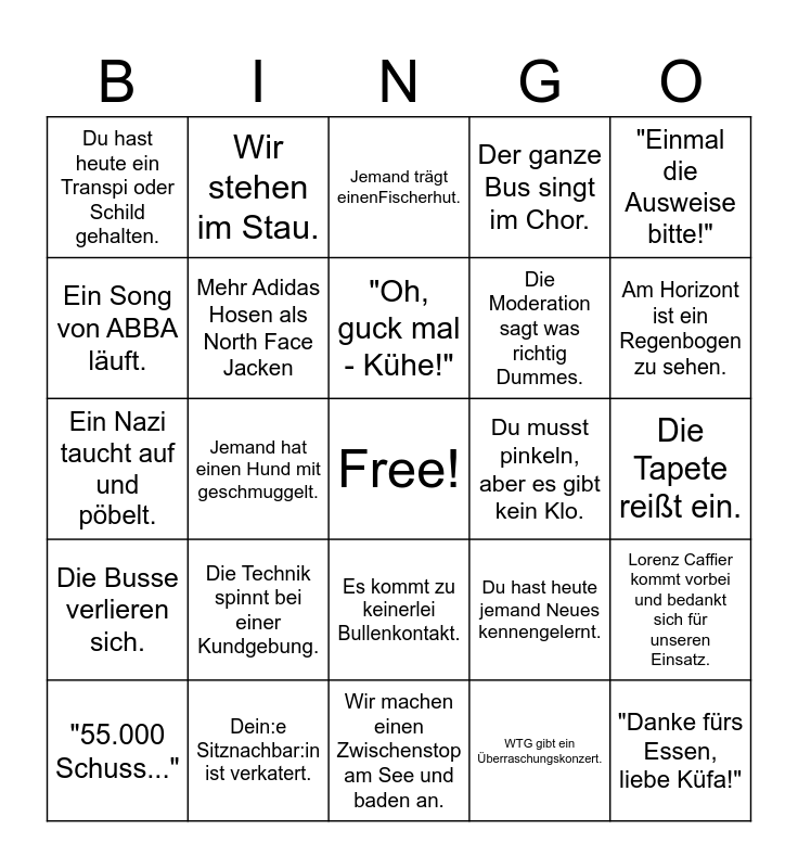 This bingo card has a free space and 24 words: Die Technik spinnt bei einer Kundgebung., Dein:e Sitznachbar:in ist verkatert., "Oh, guck mal - Kühe!", "55.000 Schuss...", "Einmal die Ausweise bitte!", Du hast heute ein Transpi oder Schild gehalten., Ein Song von ABBA läuft., Wir stehen im Stau., Du musst pinkeln, aber es gibt kein Klo., Es kommt zu keinerlei Bullenkontakt., Die Moderation sagt was richtig Dummes., Ein Nazi taucht auf und pöbelt., Du hast heute jemand Neues kennengelernt., Lorenz Caffier kommt vorbei und bedankt sich für unseren Einsatz., Mehr Adidas Hosen als North Face Jacken, WTG gibt ein Überraschungskonzert., Die Tapete reißt ein., Jemand trägt einenFischerhut., Am Horizont ist ein Regenbogen zu sehen., Jemand hat einen Hund mit geschmuggelt., "Danke fürs Essen, liebe Küfa!", Die Busse verlieren sich., Der ganze Bus singt im Chor. and Wir machen einen Zwischenstop am See und baden an..