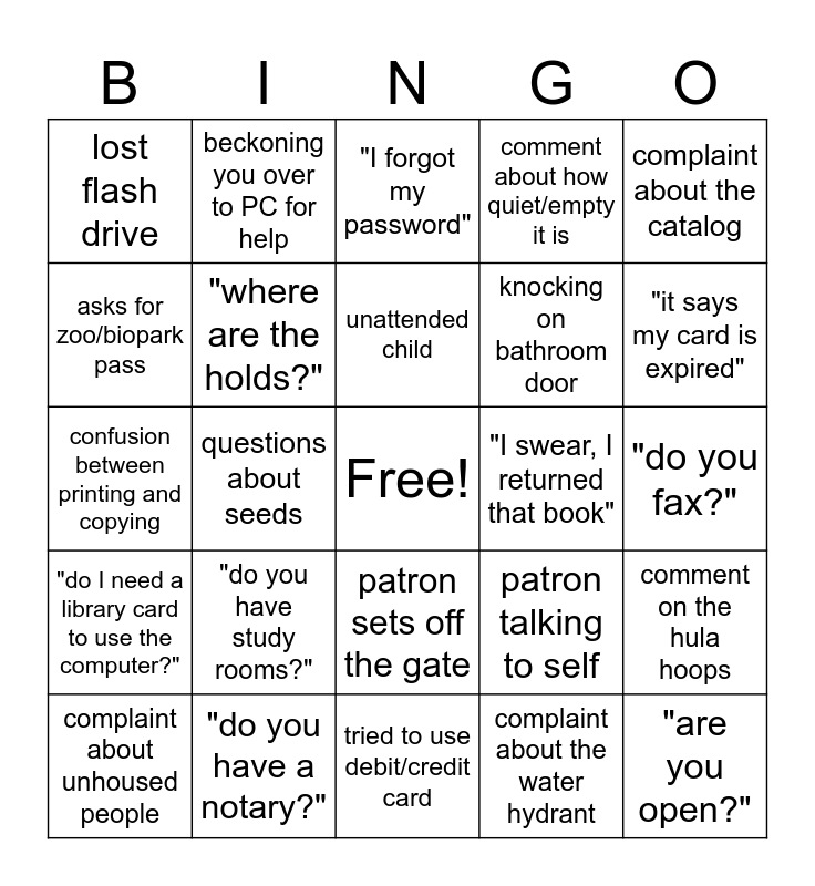 This bingo card has a free space and 32 words: complaint about the water hydrant, diss against IDL, questions about seeds, confusion about where returns go, "do I need a library card to use the computer?", "where are the holds?", complaint about the catalog, comment on the hula hoops, beckoning you over to PC for help, some form of "I'm computer illiterate", unattended child, "I forgot my password", "I don't have my card with me", loud cell phone call, "I swear, I returned that book", audible music from headphones, complaint about unhoused people, confusion between printing and copying, patron sets off the gate, "do you have study rooms?", patron talking to self, patron trying to use catalog PCs for the internet, "do you fax?", "do you have a notary?", "are you open?", comment about how quiet/empty it is, knocking on bathroom door, asks for zoo/biopark pass, lost flash drive, tried to use debit/credit card, call about explora pass and "it says my card is expired".