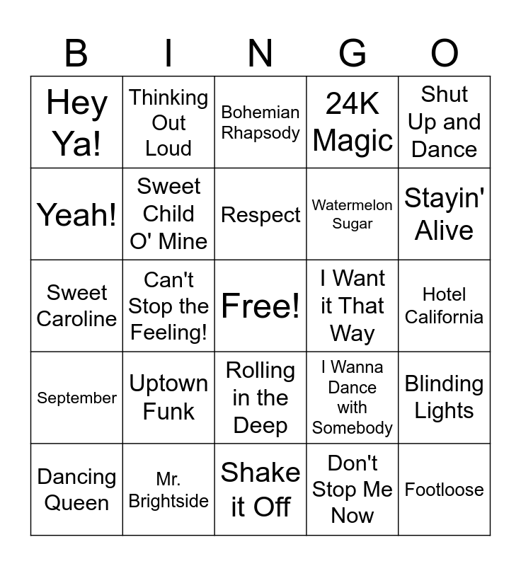 This bingo card has a free space and 29 words: Dancing Queen, Billie Jean, Can't Stop the Feeling!, Don't Stop Believin'', Hey Ya!, Bohemian Rhapsody, Sweet Child O' Mine, Uptown Funk, I Want it That Way, Mr. Brightside, Hotel California, Footloose, Shake it Off, Don't Stop Me Now, Stayin' Alive, Old Town Road, Rolling in the Deep, September, Shut Up and Dance, Sweet Caroline, I Wanna Dance with Somebody, Africa, Watermelon Sugar, Yeah!, 24K Magic, Thinking Out Loud, Blinding Lights, Respect and I Will Survive.