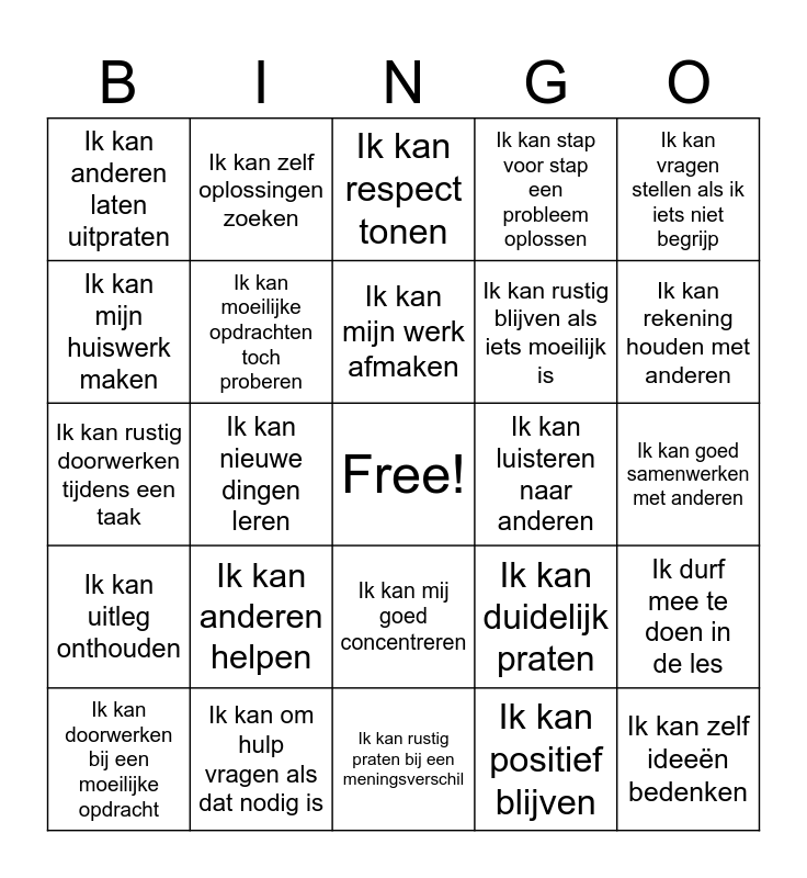 This bingo card has a free space and 40 words: Ik kan zelfstandig werken, Ik kan rustig doorwerken tijdens een taak, Ik kan netjes werken, Ik kan moeilijke opdrachten toch proberen, Ik kan om hulp vragen als dat nodig is, Ik kan mij goed concentreren, Ik kan mijn werk afmaken, Ik kan goed nadenken over een opdracht, Ik kan vragen stellen als ik iets niet begrijp, Ik kan uitleg onthouden, Ik kan nieuwe dingen leren, Ik kan stap voor stap een probleem oplossen, Ik kan zelf ideeën bedenken, Ik kan goed samenwerken met anderen, Ik kan luisteren naar anderen, Ik kan anderen helpen, Ik kan mijn mening geven in een groep, Ik kan anderen laten uitpraten, Ik kan vriendelijk zijn tegen anderen, Ik kan respect tonen, Ik durf mee te doen in de les, Ik kan positief blijven, Ik kan rustig blijven als iets moeilijk is, Ik kan mijn huiswerk maken, Ik kan mijn spullen goed verzorgen, Ik kan nadenken over mijn eigen werk, Ik kan mijn fouten verbeteren, Ik kan mij aan afspraken houden, Ik kan blijven proberen als iets moeilijk is, Ik geef niet snel op, Ik wil beter worden, Ik kan doorwerken bij een moeilijke opdracht, Ik kan goed luisteren naar mensen, Ik kan duidelijk praten, Ik kan rekening houden met anderen, Ik kan rustig praten bij een meningsverschil, Ik kan taken plannen, Ik kan keuzes maken, Ik kan zelf oplossingen zoeken and Ik kan dingen zelf regelen.
