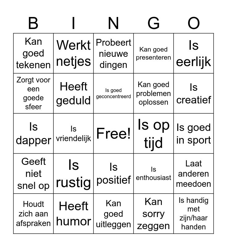 This bingo card has a free space and 33 words: Helpt anderen, Werkt goed samen, Is vriendelijk, Kan goed luisteren, Geeft niet snel op, Heeft geduld, Is eerlijk, Houdt zich aan afspraken, Werkt netjes, Werkt hard, Is goed geconcentreerd, Probeert nieuwe dingen, Kan goed plannen, Maakt werk af, Is op tijd, Is creatief, Heeft humor, Is dapper, Is rustig, Is enthousiast, Is positief, Is zelfstandig, Kan goed tekenen, Is goed in sport, Kan goed uitleggen, Is handig met zijn/haar handen, Kan goed presenteren, Kan goed problemen oplossen, Zorgt voor een goede sfeer, Laat anderen meedoen, Geeft complimenten, Kan sorry zeggen and Komt voor anderen op.