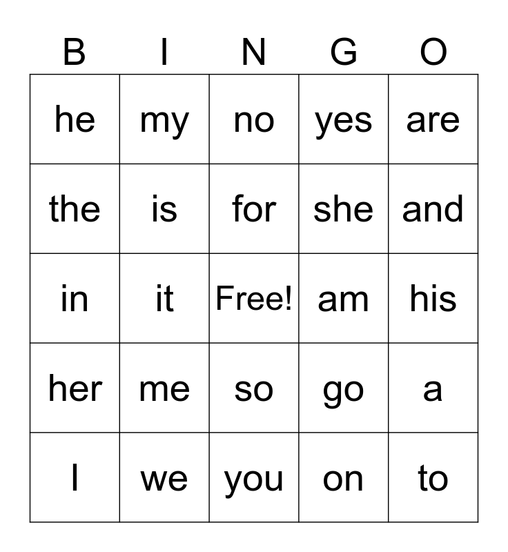 This bingo card has a free space and 24 words: me, we, for, I, are, he, the, my, am, so, she, in, go, a, is, on, his, no, and, it, to, her, yes and you.