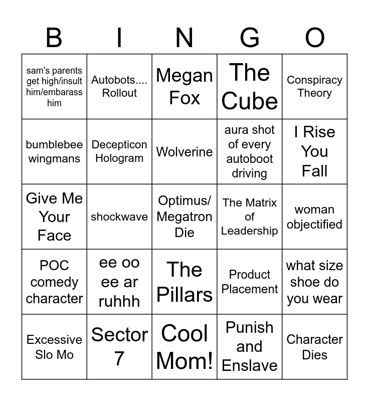 This bingo card has a free space and 44 words: Mojo!, Character Dies, White Sparkler, Excessive Slo Mo, Ladiesman217, Punish and Enslave, Megan Fox, Retcon, Conspiracy Theory, Sector 7, The Cube, The Matrix of Leadership, The Pillars, ee oo ee ar ruhhh, LEFT CHEEK, Cool Mom!, Optimus JETPACK, Give Me Your Face, Time to Find Out, I Rise You Fall, Autobots.... Rollout, scans and copies cooler car, sam crashout, sam's parents get high/insult him/embarass him, BUMBLEBEEE!!!, woman objectified, American flag, tiny little freaky decepticon, Product Placement, POC comedy character, there wasnt a tighter shirt, what size shoe do you wear, decepticon sexual assault, chicago, shockwave, devastator, dingdongs, McDreamy, Wolverine, bumblebee wingmans, aura shot of every autoboot driving, Pentagon, Decepticon Hologram and lens flare.