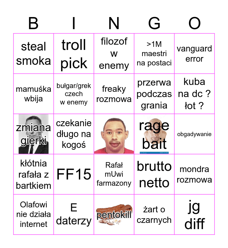 This bingo card has 3 images, a free space and 24 words: FF15, E daterzy, freaky rozmowa, Olafowi nie działa internet, vanguard error, steal smoka, mamuśka wbija, troll pick, rage bait, Rafał mUwi farmazony, przerwa podczas grania, zmiana gierki, brutto netto, mondra rozmowa, bułgar/grek czech w enemy, żart o czarnych, obgadywanie, filozof w enemy, kuba na dc ? łot ?, czekanie długo na kogoś, jg diff, kłótnia rafała z bartkiem, >1M maestri na postaci and pentokill.