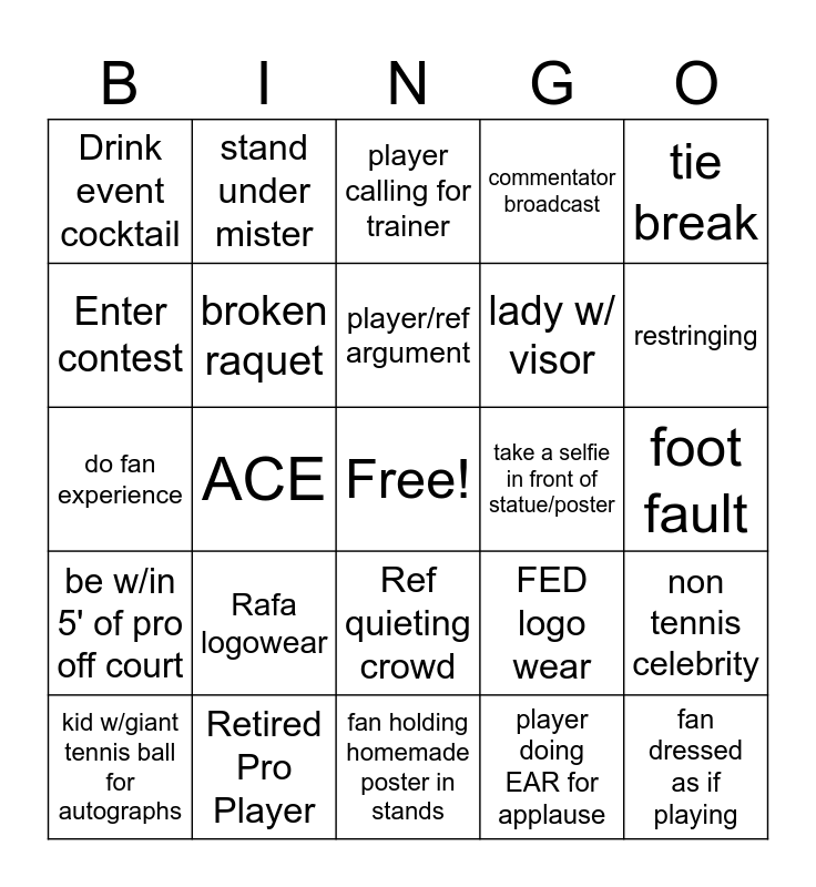 This bingo card has a free space and 24 words: Rafa logowear, Retired Pro Player, player/ref argument, kid w/giant tennis ball for autographs, tie break, Drink event cocktail, Enter contest, stand under mister, take a selfie in front of statue/poster, Ref quieting crowd, lady w/ visor, do fan experience, FED logo wear, non tennis celebrity, broken raquet, player doing EAR for applause, foot fault, player calling for trainer, restringing, ACE, fan dressed as if playing, be w/in 5' of pro off court, commentator broadcast and fan holding homemade poster in stands.