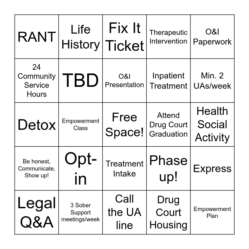 This bingo card has a free space and 24 words: Opt-in, 3 Sober Support meetings/week, O&I Presentation, Legal Q&A, O&I Paperwork, RANT, 24 Community Service Hours, Life History, Attend Drug Court Graduation, Treatment Intake, Inpatient Treatment, Detox, Phase up!, Express, TBD, Drug Court Housing, Health Social Activity, Fix It Ticket, Min. 2 UAs/week, Empowerment Class, Empowerment Plan, Be honest, Communicate, Show up!, Therapeutic Intervention and Call the UA line.