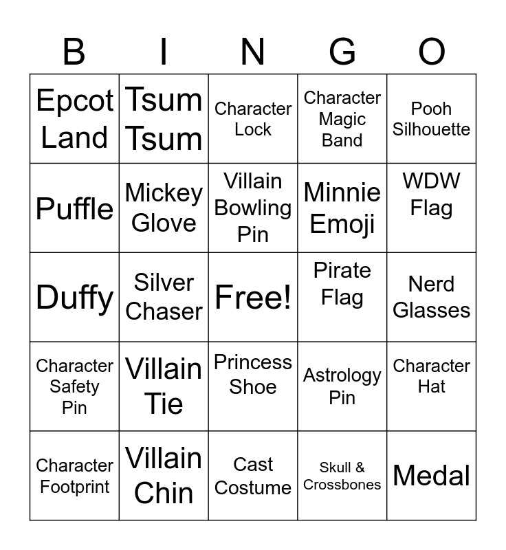 This bingo card has a free space and 24 words: Villain Tie, Villain Chin, Villain Bowling Pin, Character Footprint, Pooh Silhouette, Epcot Land, Puffle, Tsum Tsum, Pirate Flag, Princess Shoe, Minnie Emoji, Duffy, Astrology Pin, Character Hat, Mickey Glove, Skull & Crossbones, Nerd Glasses, Character Lock, WDW Flag, Silver Chaser, Medal, Character Safety Pin, Character Magic Band and Cast Costume.