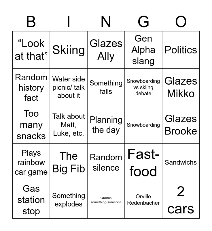 This bingo card has a free space and 24 words: The Big Fib, Something explodes, Something falls, Gas station stop, Politics, “Look at that”, Random history fact, Skiing, Snowboarding, Random silence, Snowboarding vs skiing debate, Too many snacks, Fast-food, Sandwichs, Water side picnic/ talk about it, Orville Redenbacher, Glazes Brooke, Glazes Ally, Glazes Mikko, Talk about Matt, Luke, etc., 2 cars, Plays rainbow car game, Gen Alpha slang and Quotes something/someone.