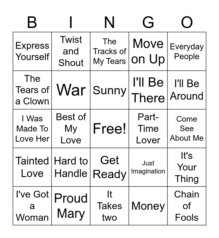 This bingo card has a free space and 24 words: Hard to Handle, Proud Mary, Sunny, I've Got a Woman, Everyday People, Express Yourself, The Tears of a Clown, Twist and Shout, Part-Time Lover, Get Ready, I'll Be There, I Was Made To Love Her, Just Imagination, It's Your Thing, War, Money, Come See About Me, The Tracks of My Tears, I'll Be Around, Best of My Love, Chain of Fools, Tainted Love, Move on Up and It Takes two.