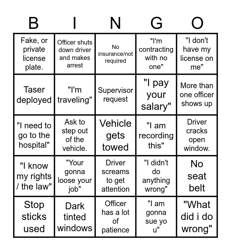 This bingo card has 36 words: "Name/Badge Number", "I'm not resisting", "Bro", "I'm traveling", "I didn't do anything wrong", "I know my rights / the law", Supervisor request, "I don't need a drivers License", "I don't have my license on me", Window gets broke., Ask to step out of the vehicle., "I'm contracting with no one", Driver starts to name call, "I am recording this", More than one officer shows up, Fake, or private license plate., "What did i do wrong", "Your gonna loose your job", Vehicle gets towed, No insurance/not required, Driver cracks open window., No seat belt, Dark tinted windows, Stop sticks used, Officer has a lot of patience, Officer shuts down driver and makes arrest, "I need to go to the hospital", Driver/passengers dramatizes being hurt, "I pay your salary", Taser deployed, "Don't touch me/my vehicle", "Their kidnapping me/stealing my vehicle", "I am gonna sue you", Driver screams to get attention, "For what" and "Are you serious".