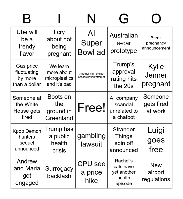 This bingo card has a free space and 24 words: Trump has a public health crisis, Surrogacy backlash, Another high profile assassination/attempt, Andrew and Maria get engaged, Burns pregnancy announcement, Ube will be a trendy flavor, Gas price fluctuating by more than a dollar, I cry about not being pregnant, AI company scandal unrelated to a chatbot, gambling lawsuit, Trump's approval rating hits the 20s, Someone at the White House gets fired, Stranger Things spin off announced, Luigi goes free, We learn more about microplastics and it's bad, Rachel's cats have yet another health episode, Someone gets fired at work, AI Super Bowl ad, Kylie Jenner pregnant, Boots on the ground in Greenland, New airport regulations, Kpop Demon hunters sequel announced, Australian e-car prototype and CPU see a price hike.