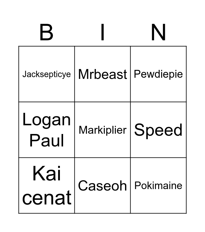 This bingo card has a free space and 8 words: Speed, Pewdiepie, Mrbeast, Kai cenat, Jacksepticye, Pokimaine, Logan Paul and Caseoh.