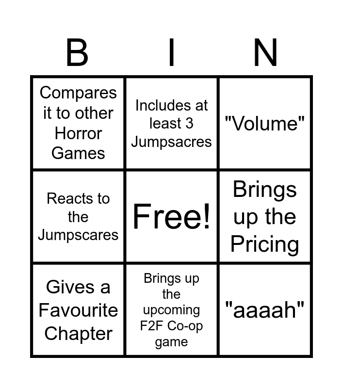 This bingo card has a free space and 13 words: "Real Horror", Glazes the Games, Gives a Favourite Chapter, Includes at least 3 Jumpsacres, Reacts to the Jumpscares, "aaaah", Ranks the Chapters, "Norwood Hitch hike is the worst one", Brings up the upcoming F2F Co-op game, Compares it to other Horror Games, Brings up the Pricing, "Volume" and Scooby Doo Reference.