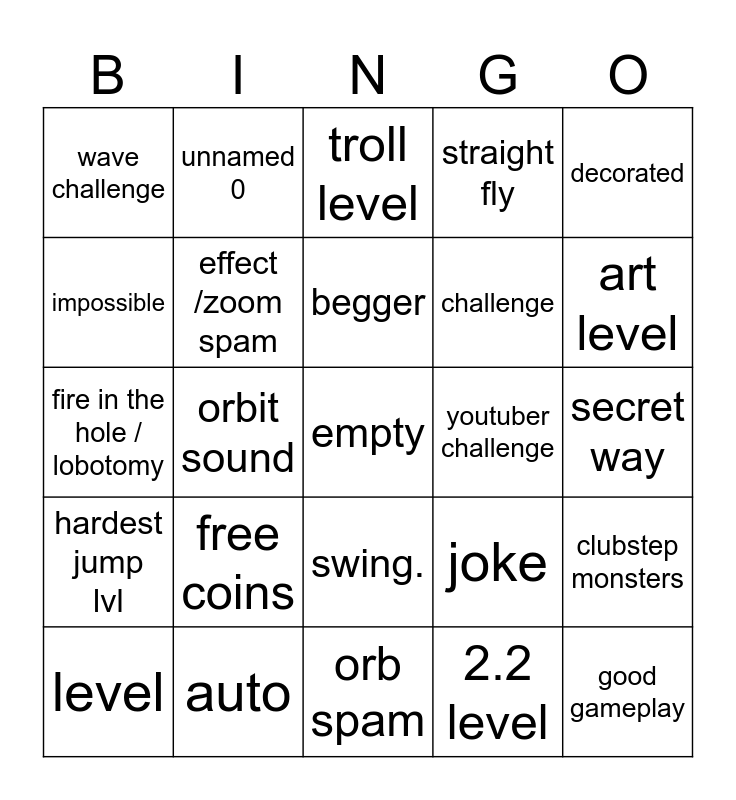 This bingo card has a free space and 24 words: free coins, auto, begger, level, decorated, wave challenge, impossible, unnamed 0, youtuber challenge, swing., challenge, fire in the hole / lobotomy, joke, clubstep monsters, effect /zoom spam, 2.2 level, secret way, troll level, art level, orbit sound, good gameplay, hardest jump lvl, straight fly and orb spam.