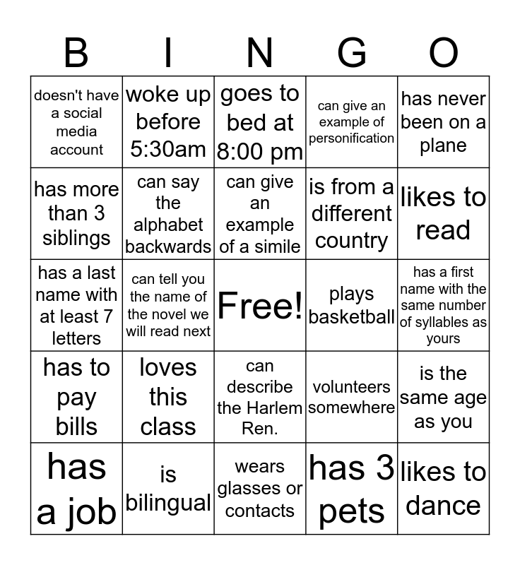 This bingo card has a free space and 24 words: loves this class, is bilingual, can give an example of a simile, has a job, has never been on a plane, doesn't have a social media account, has more than 3 siblings, woke up before 5:30am, plays basketball, can describe the Harlem Ren., is from a different country, has a last name with at least 7 letters, volunteers somewhere, is the same age as you, can say the alphabet backwards, has 3 pets, has a first name with the same number of syllables as yours, goes to bed at 8:00 pm, likes to read, can tell you the name of the novel we will read next, likes to dance, has to pay bills, can give an example of personification and wears glasses or contacts.