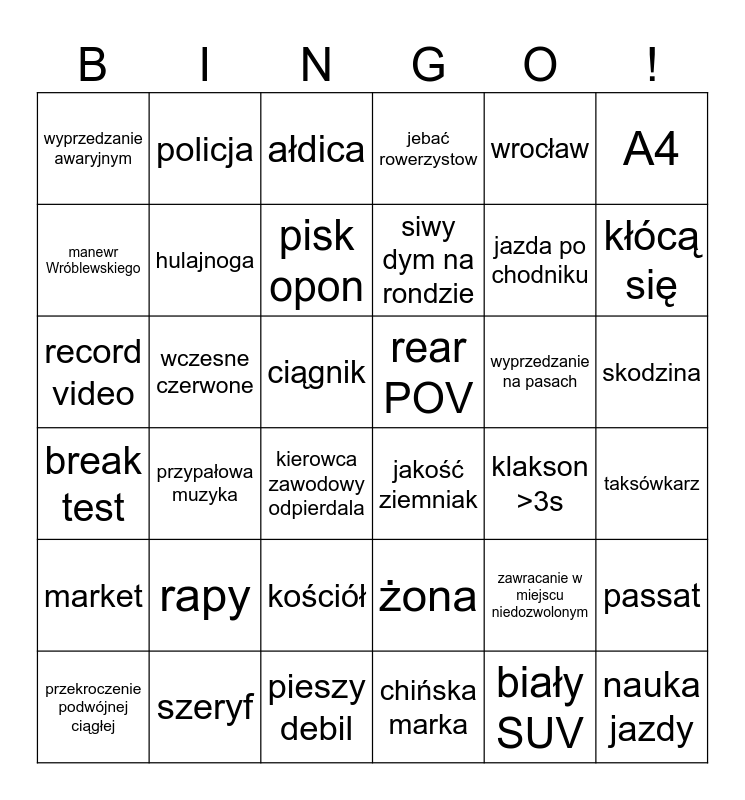 This bingo card has 50 words: wyprzedzanie na trzeciego, record video, motocyklista debil, klakson >3s, wyprzedzanie na pasach, szeryf, policja, jazda pod prąd, A4, pieszy debil, manewr Wróblewskiego, jebać rowerzystow, przypałowa muzyka, break test, wina nagrywajacego, żona, hulajnoga, wczesne czerwone, Wymuszenie pierwszeństwa (FREE), wrocław, kłócą się, taksówkarz, wyprzedzanie awaryjnym, pisk opon, martwe pole, market, siwy dym na rondzie, opelek, ałdica, skodzina, random event, zawracanie w miejscu niedozwolonym, zwierzę, busiarz, jakość ziemniak, kościół, chińska marka, biały SUV, nauka jazdy, ciągnik, przekroczenie podwójnej ciągłej, bmw, passat, kurwa, kierowca zawodowy odpierdala, jazda po chodniku, rapy, podcast, rear POV and ścinanie zakrętu.