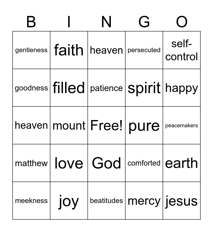 This bingo card has a free space and 24 words: love, joy, patience, meekness, self-control, gentleness, goodness, faith, pure, God, spirit, heaven, comforted, earth, filled, mercy, peacemakers, heaven, happy, mount, jesus, matthew, persecuted and beatitudes.