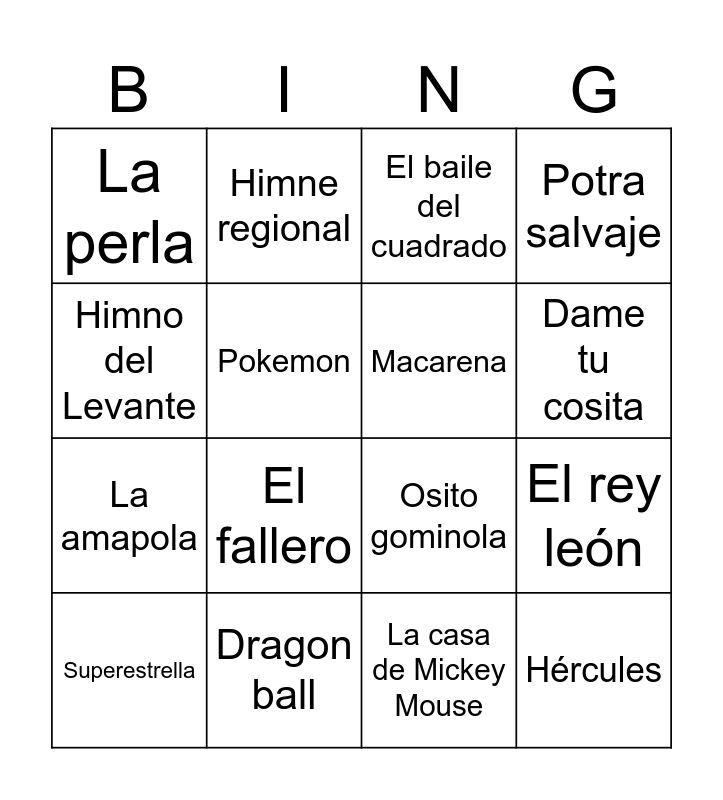 This bingo card has 51 words: Free!, Superestrella, La Morocha, Mediterrània, Golden, Sodapop, Himne regional, Oliver y benji, Pokemon, Un besito nada mas, Macarena, Potra salvaje, Frozen, Vaiana, DTMF, Esa diva, Dame tu cosita, Dragon ball, Amunt Valencia, Himno del Levante, El rey león, Aladdin, La perla, La amapola, Salir niñas al balcón, Paquito el chocolatero, El fallero, Spidey, Soy una taza, El baile del cuadrado, Waka Waka, Baby shark, Bluey, Toy story, Danza Kuduro, Sofia, La gozadera, Shake it off, Barbie girl, La sirenita, La casa de Mickey Mouse, Hércules, El fin del mundo, Power rangers, Patrulla canina, Madre tierra, Osito gominola, Nochentera, Las babys, Zootropolis and Gone Gone Gone.