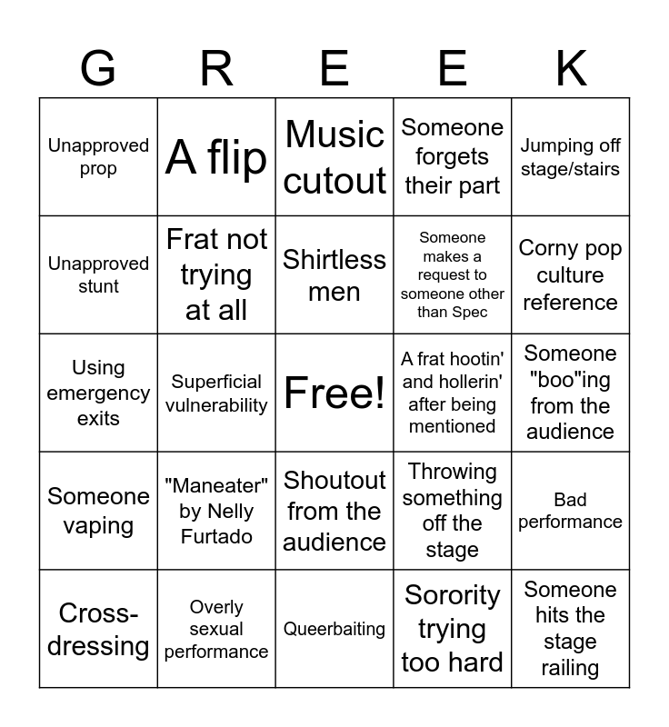 This bingo card has a free space and 24 words: "Maneater" by Nelly Furtado, Overly sexual performance, Shirtless men, Cross-dressing, Jumping off stage/stairs, Unapproved prop, Unapproved stunt, A flip, A frat hootin' and hollerin' after being mentioned, Shoutout from the audience, Someone makes a request to someone other than Spec, Using emergency exits, Throwing something off the stage, Bad performance, Frat not trying at all, Sorority trying too hard, Someone "boo"ing from the audience, Music cutout, Corny pop culture reference, Superficial vulnerability, Someone hits the stage railing, Someone vaping, Someone forgets their part and Queerbaiting.