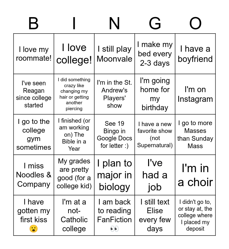 This bingo card has a free space and 24 words: My grades are pretty good (for a college kid), I'm at a not-Catholic college, I'm in the St. Andrew's Players' show, I have gotten my first kiss 😮, I have a boyfriend, I love my roommate!, I've seen Reagan since college started, I love college!, I have a new favorite show (not Supernatural), I plan to major in biology, I'm going home for my birthday, I go to the college gym sometimes, I've had a job, I'm in a choir, I did something crazy like changing my hair or getting another piercing, I still text Elise every few days, I go to more Masses than Sunday Mass, I still play Moonvale, I'm on Instagram, I finished (or am working on) The Bible in a Year, I didn't go to, or stay at, the college where I placed my deposit, I miss Noodles & Company, I make my bed every 2-3 days and I am back to reading FanFiction 👀.