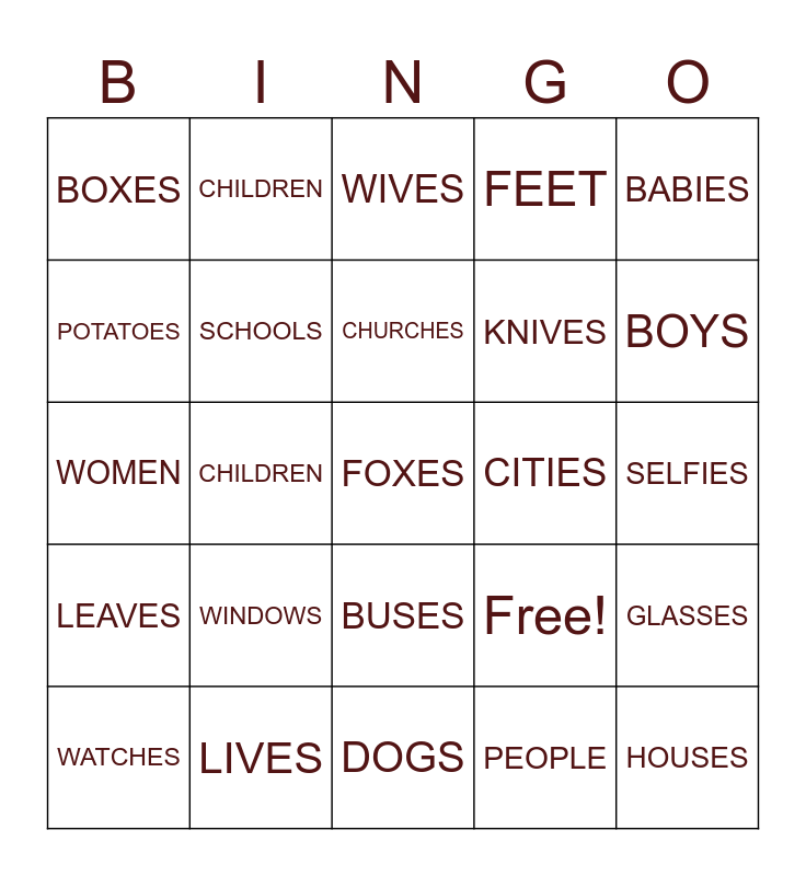 This bingo card has 25 words: WINDOWS, DOGS, CHURCHES, WATCHES, BABIES, BOXES, POTATOES, CHILDREN, CITIES, BUSES, KNIVES, WOMEN, Free!, GLASSES, SCHOOLS, HOUSES, SELFIES, WIVES, BOYS, CHILDREN, FOXES, LIVES, LEAVES, FEET and PEOPLE.