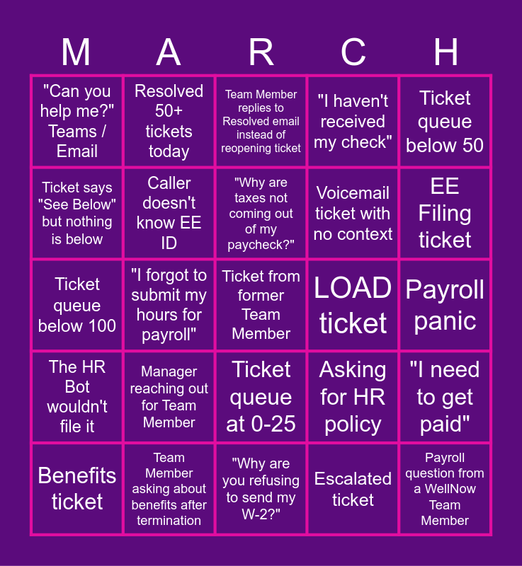 This bingo card has 35 words: Team Member asking when benefits start, HR Ops ticket, "I have a question" with no details, Voicemail ticket with no context, Payroll question from a WellNow Team Member, "Can you help me?" Teams / Email, Caller doesn't know EE ID, Duplicate ticket submitted, LOAD ticket, Ticket submitted without attachments mentioned, Ticket queue below 100, Resolved 50+ tickets today, Ticket queue at 0-25, Resolved 125+ tickets this week, Ticket queue below 50, The HR Bot wouldn't file it, Team Member asking about benefits after termination, Team Member replies to Resolved email instead of reopening ticket, Escalated ticket, Payroll panic, Benefits ticket, "I forgot to submit my hours for payroll", Ticket from former Team Member, My manager told me to contact HR, EE Filing ticket, Ticket says "See Below" but nothing is below, Fake news tickets, "Why are you refusing to send my W-2?", Asking for HR policy, "I need to get paid", No response following outreach, Manager reaching out for Team Member, "Why are taxes not coming out of my paycheck?", "I haven't received my check" and "Where do I find my paystubs?".