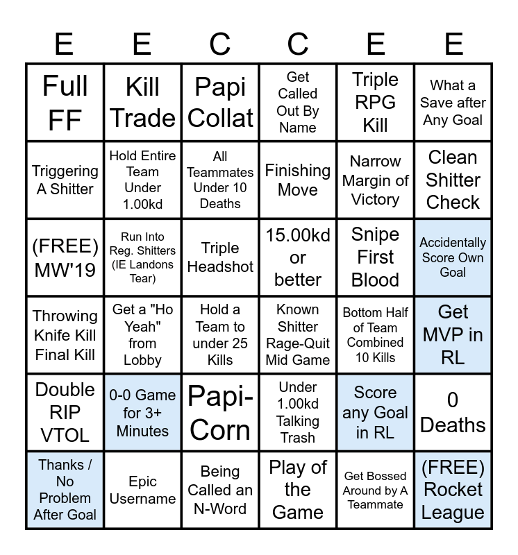 This bingo card has 36 words: Under 1.00kd Talking Trash, Papi-Corn, Play of the Game, Triggering A Shitter, Throwing Knife Kill Final Kill, 15.00kd or better, Hold Entire Team Under 1.00kd, Being Called an N-Word, Triple RPG Kill, Score any Goal in RL, Clean Shitter Check, Get Called Out By Name, 0 Deaths, Run Into Reg. Shitters (IE Landons Tear), Finishing Move, Full FF, Double RIP VTOL, Snipe First Blood, (FREE) MW'19, Papi Collat, Triple Headshot, Get a "Ho Yeah" from Lobby, Known Shitter Rage-Quit Mid Game, Hold a Team to under 25 Kills, Bottom Half of Team Combined 10 Kills, Kill Trade, Narrow Margin of Victory, Epic Username, All Teammates Under 10 Deaths, What a Save after Any Goal, (FREE) Rocket League, Thanks / No Problem After Goal, Get MVP in RL, Accidentally Score Own Goal, 0-0 Game for 3+ Minutes and Get Bossed Around by A Teammate.