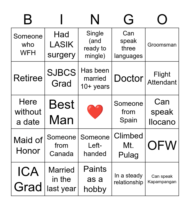 This bingo card has a free space and 39 words: An only child, Has one younger brother, UST Grad, SJBCS Grad, ICA Grad, Someone Left- handed, Has been married 10+ years, Bridesmaid, Groomsman, Maid of Honor, Best Man, Can speak three languages, Can speak Kapampangan, Can speak Ilocano, Someone from Spain, Someone from Canada, Someone from Australia, Someone who WFH, DJ, Climbed Mt. Pulag, Retiree, Paints as a hobby, Doctor, Flight Attendant, Been to San Francisco, Owns a business, Someone born in June, Someone born in November, Has a cat, Had LASIK surgery, Sings as a hobby, Loves to bake, Single (and ready to mingle), Married in the last year, In a steady relationship, Medtech, OFW, Here without a date and Plays a musical instrument.