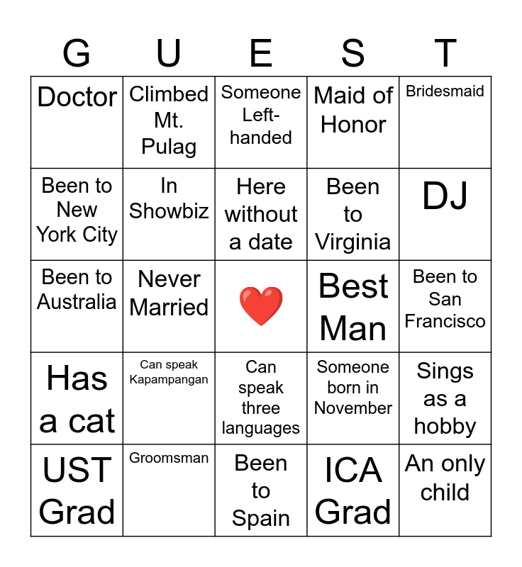 This bingo card has a free space and 44 words: Plays a musical instrument, An only child, Has one younger brother, UST Grad, SJBCS Grad, ICA Grad, Someone Left- handed, Has been married 10+ years, Bridesmaid, Groomsman, Maid of Honor, Best Man, Can speak three languages, Can speak Kapampangan, Can speak Ilocano, Been to Spain, Been to Canada, Been to Australia, Someone who WFH, DJ, Climbed Mt. Pulag, Retiree, Paints as a hobby, Doctor, Flight Attendant, Been to San Francisco, Owns a business, Someone born in June, Someone born in November, Has a cat, Had LASIK surgery, Sings as a hobby, Loves to bake, Single (and ready to mingle), Never Married, In a steady relationship, Medtech, OFW, Here without a date, Been to New York City, Been to Virginia, Been to Singapore, In Showbiz and Accountant.