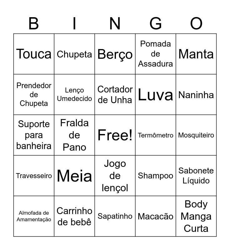 This bingo card has a free space and 49 words: Fralda Descartável, Body Manga Curta, Body Manga Longa, Sapatinho, Meia, Babador, Chupeta, Mamadeira, Prendedor de Chupeta, Toalha de Banho, Lenço Umedecido, Pomada de Assadura, Sabonete Líquido, Shampoo, Condicionador, Escova de Cabelo, Cortador de Unha, Termômetro, Aspirador Nasal, Manta, Fralda de Pano, Macacão, Touca, Luva, Mordedor, Naninha, Almofada de Amamentação, Banheira, Jogo de lençol, Travesseiro, Protetor de berço, Escova para lavar mamadeira, Trocador, Bebê conforto, Carrinho de bebê, Cobertor, Creme para assadura, Saida maternidade, Mosquiteiro, Talco, Oleo, Casaquinhos, Pacotes de algodão, Cotonetes, Suporte para banheira, Berço, Kit Mamadeiras, Porta mamadeira térmico and Porta chupetas.
