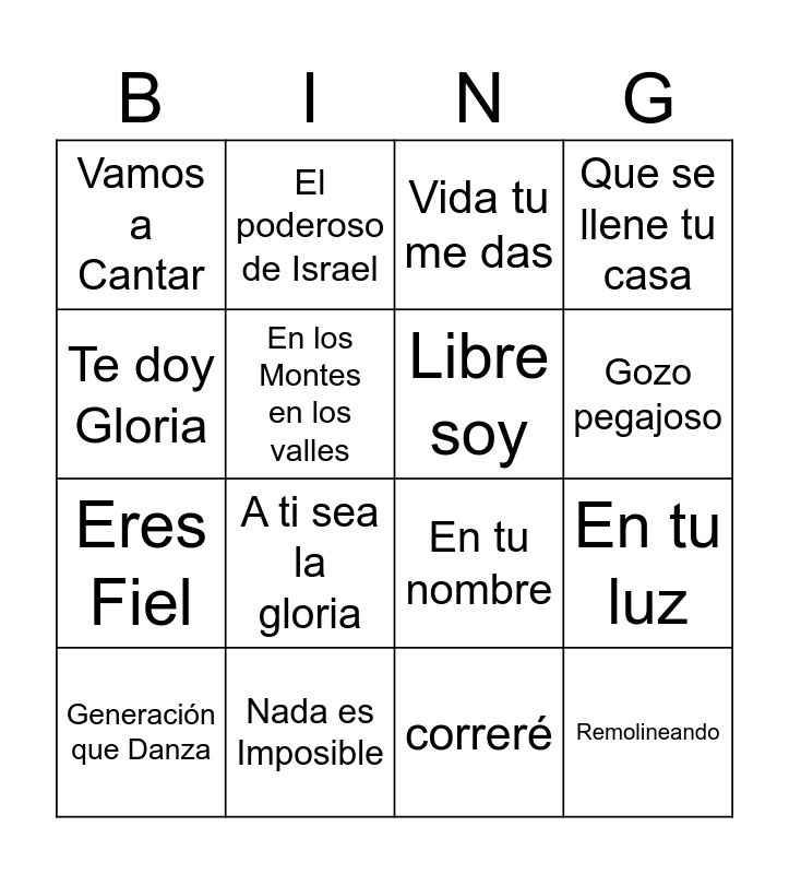 This bingo card has 28 words: Grande y Fuerte, Tómalo, Eres Fiel, Cambiaré mi Tristeza, En los Montes en los valles, Vida tu me das, El poderoso de Israel, Remolineando, Nada es Imposible, Por siempre te alabaré, En tu nombre, Que se llene tu casa, Gloria en lo alto, Toda lengua y toda Nación, A ti sea la gloria, Danzo en el río, Derrama de tu fuego, Libre soy, Gozo pegajoso, Me Gozaré, Vamos a Cantar, Hosanna, Generación que Danza, En tu luz, correré, Anclado en la roca, Te doy Gloria and Vivo estás.