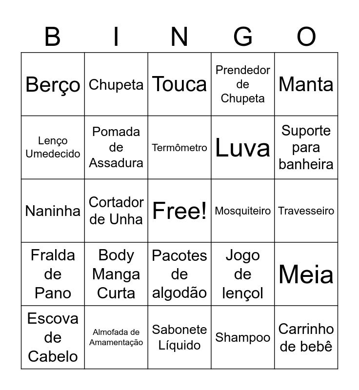 This bingo card has a free space and 49 words: Fralda Descartável, Body Manga Curta, Body Manga Longa, Sapatinho, Meia, Babador, Chupeta, Mamadeira, Prendedor de Chupeta, Toalha de Banho, Lenço Umedecido, Pomada de Assadura, Sabonete Líquido, Shampoo, Condicionador, Escova de Cabelo, Cortador de Unha, Termômetro, Aspirador Nasal, Manta, Fralda de Pano, Macacão, Touca, Luva, Mordedor, Naninha, Almofada de Amamentação, Banheira, Jogo de lençol, Travesseiro, Protetor de berço, Escova para lavar mamadeira, Trocador, Bebê conforto, Carrinho de bebê, Cobertor, Creme para assadura, Saida maternidade, Mosquiteiro, Talco, Oleo, Casaquinhos, Pacotes de algodão, Cotonetes, Suporte para banheira, Berço, Kit Mamadeiras, Porta mamadeira térmico and Porta chupetas.