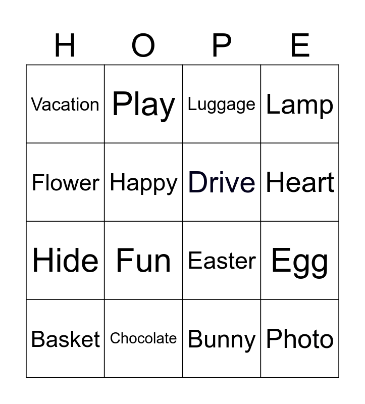 This bingo card has 16 words: Chocolate, Egg, Luggage, Vacation, Hide, Play, Easter, Bunny, Flower, Happy, Basket, Lamp, Fun, Heart, Drive and Photo.