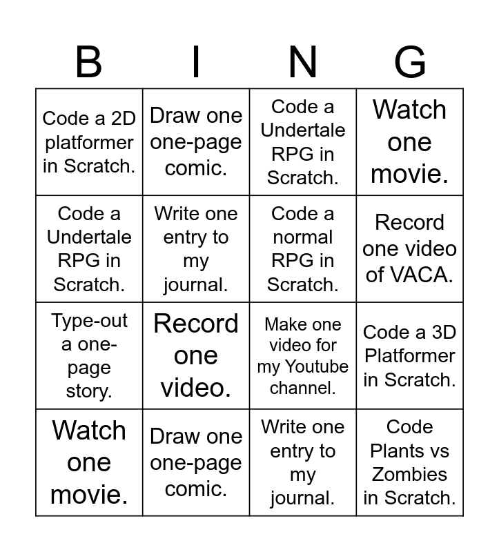 ⚠ This card has duplicate items: Code a Backroom game using Raycasting in Scratch. (2), Code a 3D Platformer in Scratch. (2), Code Plants vs Zombies in Scratch. (2), Code a 2D platformer in Scratch. (2), Code a Undertale RPG in Scratch. (2), Code a normal RPG in Scratch. (2), Draw one OC Character. (2), Draw one one-page comic. (2), Type-out a one-page story. (2), Write one entry to my journal. (2), Watch one movie. (2), Fold one origami tutorial. (2)