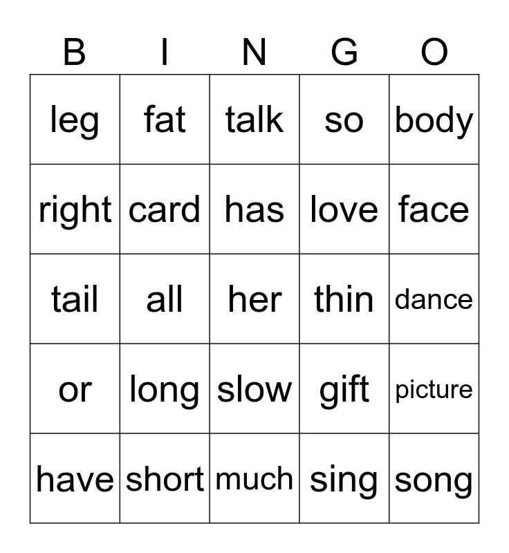 This bingo card has a free space and 24 words: long, short, has, have, body, leg, right, fat, thin, slow, love, tail, gift, picture, card, sing, dance, talk, face, all, song, or, so and much.