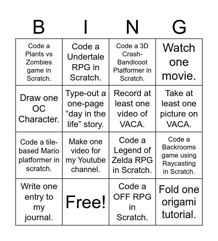 This bingo card has 16 words: Free!, Code a Backrooms game using Raycasting in Scratch., Code a 3D Crash-Bandicoot Platformer in Scratch., Code a Plants vs Zombies game in Scratch., Code a tile-based Mario platformer in scratch., Code a Undertale RPG in Scratch., Code a Legend of Zelda RPG in Scratch., Code a OFF RPG in Scratch., Draw one OC Character., Type-out a one-page “day in the life” story., Write one entry to my journal., Watch one movie., Make one video for my Youtube channel., Take at least one picture on VACA., Record at least one video of VACA. and Fold one origami tutorial..