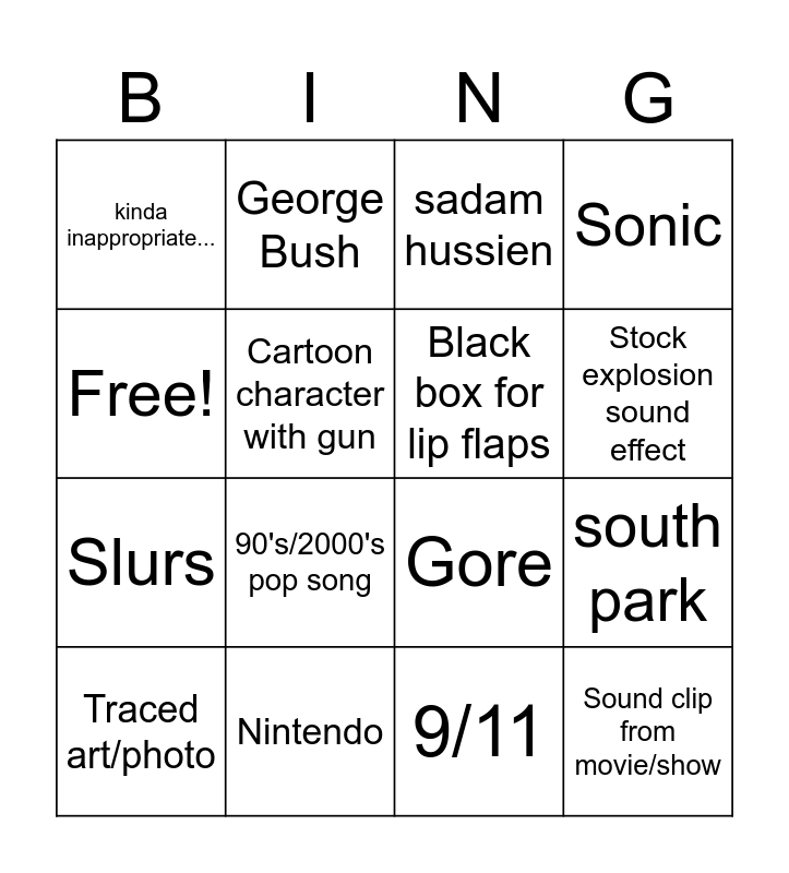 This bingo card has 16 words: Nintendo, south park, sadam hussien, kinda inappropriate..., Slurs, George Bush, Gore, 9/11, Free!, Cartoon character with gun, Traced art/photo, Sonic, 90's/2000's pop song, Stock explosion sound effect, Black box for lip flaps and Sound clip from movie/show.