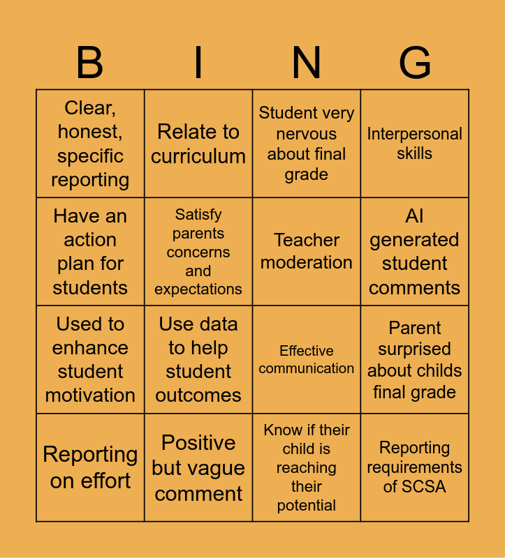 This bingo card has 16 words: Positive but vague comment, Parent surprised about childs final grade, Student very nervous about final grade, Clear, honest, specific reporting, Used to enhance student motivation, Relate to curriculum, Effective communication, Know if their child is reaching their potential, Have an action plan for students, Satisfy parents concerns and expectations, Reporting on effort, Interpersonal skills, Use data to help student outcomes, AI generated student comments, Teacher moderation and Reporting requirements of SCSA.