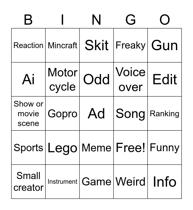 This bingo card has 25 words: Lego, Game, Odd, Small creator, Gun, Reaction, Ai, Mincraft, Song, Meme, Voice over, Show or movie scene, Free!, Funny, Motor cycle, Info, Ranking, Skit, Edit, Gopro, Ad, Instrument, Sports, Freaky and Weird.