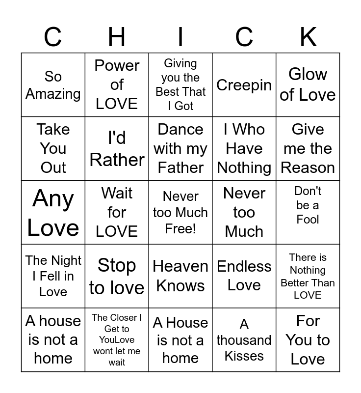 This bingo card has a free space and 24 words: A house is not a home, Stop to love, Dance with my Father, A thousand Kisses, Glow of Love, So Amazing, Power of LOVE, Giving you the Best That I Got, Never too Much, Don't be a Fool, Any Love, I'd Rather, Endless Love, There is Nothing Better Than LOVE, Take You Out, The Closer I Get to YouLove wont let me wait, A House is not a home, Creepin, Give me the Reason, The Night I Fell in Love, Wait for LOVE, Heaven Knows, I Who Have Nothing and For You to Love.