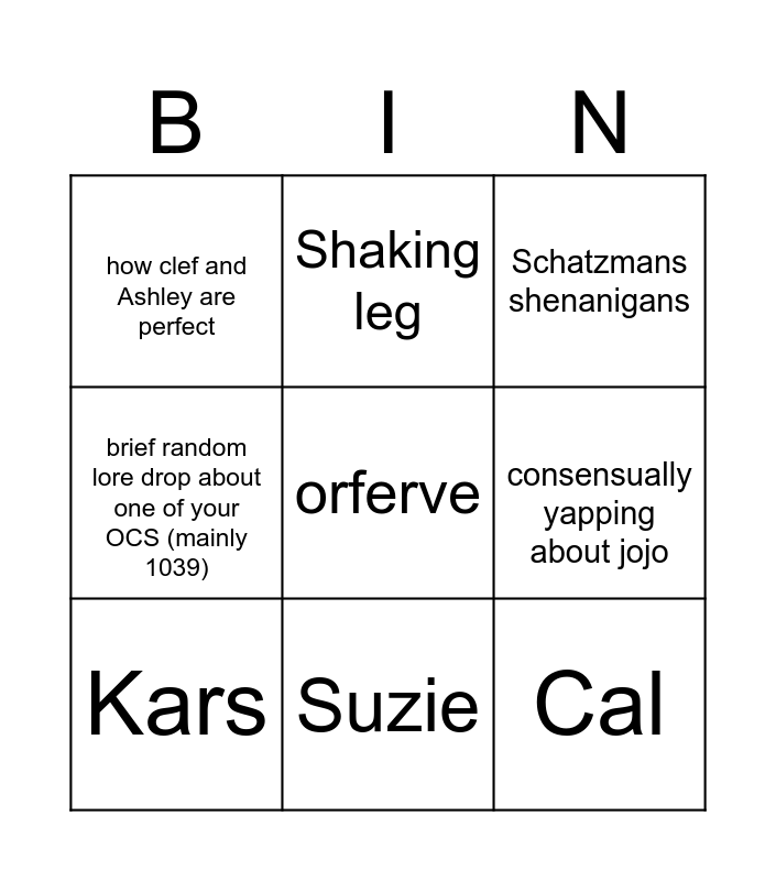 This bingo card has 9 words: Kars, Schatzmans shenanigans, Shaking leg, brief random lore drop about one of your OCS (mainly 1039), how clef and Ashley are perfect, consensually yapping about jojo, orferve, Cal and Suzie.